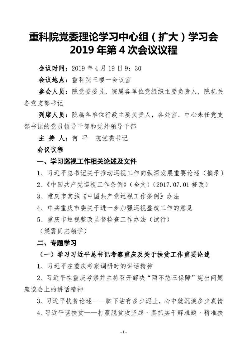 重科凯发k8官网2019年第4次理论学习中心组(扩大)学习会会议议程